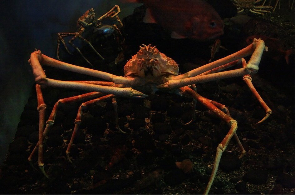 Более того, это животное можно считать крупнейшим современным членистоногим. Размах ног этого краба в вытянутом состоянии может достигать 3,8 метра, а длина панциря достигает 40 см! Масса этого краба достигает 19 кг. Его внешний вид отражен в названии - японский краб-паук (Macrocheira kaempferi). Японский краб-паук. Фото Daniel Mennerich (flickr.com) Панцирь этого краба окрашен в оранжевый или светло-коричневый цвет. он имеет форму груши и покрыт буграми и шипами. Крабы имеют интересную особенность поведения - для маскировки на дне океана они срывают губок и прочих донных животных и сажают их себе на панцирь. Делают они это при помощи длинных передних конечностей, которые несут клешни. Такие длинные конечности характерны лишь для самцов, у самок они значительно короче следующей пары ног. С возрастом ноги краба удлиняются, а панцирь практически не претерпевает изменений. Конечности также окрашены в оранжевый цвет - рисунок может быть пятнистым или полосатым. На их концах - закругленные