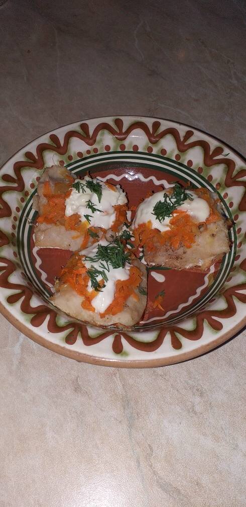 Для этого рецепта можно смело брать нежирную рыбу(хек,минтай),которая благодаря луково-морковно-сметанной заправке получается сочная и вкусная.#канiкули. Ингредиенты: нежирной рыбы, крупных моркови, средних луковицы, сметаны 20%, Соль,перец, растительное масло, зелени Способ приготовления: Разморозить рыбу,очистить,удалить хребты и мелкие кости,шкуру не снимать.Каждую половинку рыбы разделить еще напополам.Посыпать солью,перцем,оставить на 10-15мин. Лук нарезать кубиками,морковь натереть на крупной терке.Обжарить лук до мягкости,добавить морковь и пассеровать до мягкости овощей10мин. Сметану отцедить от лишней влаги. Металлический лист застелить пергаментом,выложить рыбу,сверху слой овощей и покрыть все сметаной. Поставить в разогретую до 200°духовку и выпекать 30-35мин.Готовую рыбу выложить на блюдо и при желании украсить зеленью.