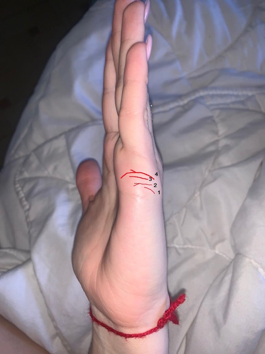 Чаще она отмечается на левой руке. Это тоненькая линия сразу над линией сердца, на фото под номером 1. Иногда таких линий несколько, а значит вы несколько раз влюбитесь до того, как на вашей руке появится глубокая, очень важная линия серьезных отношений. Может даже замуж сходите ненадолго:) Когда ко мне подходила стайка девчонок с самым животрепещущим вопросом: " А когда я выйду замуж?", - я им всем полушутя и очень просто объясняла, перед тем как посмотреть руки у каждой. Говорила, что на левой руке отмечаются все, кого пришлет вам судьба, а уж как вы с ними разберетесь - покажет правая рука. На правой обычно остаются лишь те, кого вы сочтете для себя важными. Примитивное, конечно, объяснение, но девчонкам достаточно для того, чтобы изучать свои руки и "гадать" подружкам. У меня линия первой любви перешла и на правую руку, я всю жизнь влюблена в одного мальчика-парня-мужчину, но он даже не знает об этом. Влюбилась еще в первом классе. Он пел на каком-то концерте самодеятельности, в 6