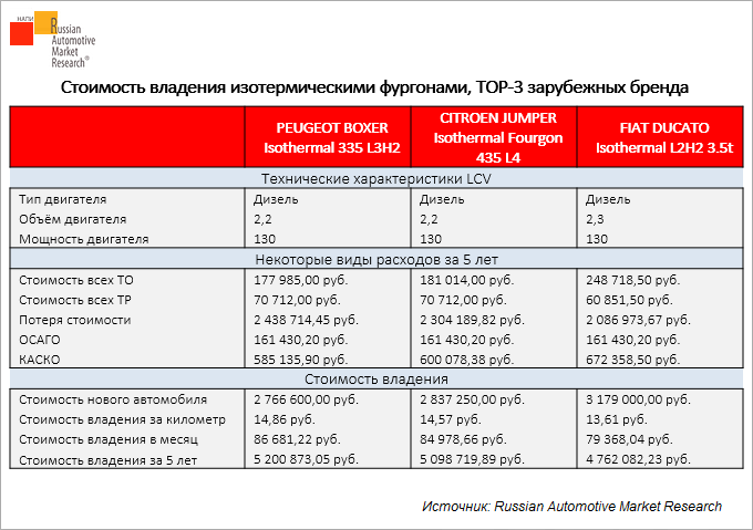 Агентство Russian Automotive Market Research проанализировало стоимость владения наиболее вытребованными изотермическими фургонами зарубежных брендов сегмента LCV в Москве. При расчете стоимости владения учитывались следующие параметры: потеря стоимости автомобиля, ОСАГО, КАСКО, транспортный налог, госпошлина, летние и зимние шины сегмента B, шиномонтаж, стоимость ТО, стоимость ремонта, расход топлива и др. Стоимость владения рассчитывалась при условии покупки автомобиля за собственные средства, владения автомобилем в течении 5 лет, среднегодовом пробеге 70 000 км. Расчет подготовлен в январе 2022 г. Стоимость владения подготовлена специализированным онлайн – калькулятором DV-TCО по всем типам автомобилей: Учитываются все затраты на региональном уровне, включая стоимость запасных частей к автомобилям, количество и стоимость нормо-часов, частоту технического осмотра и текущего ремонта, стоимость топлива, стоимость шин и др. Стоимость владения рассчитывается с учетом региональной специ