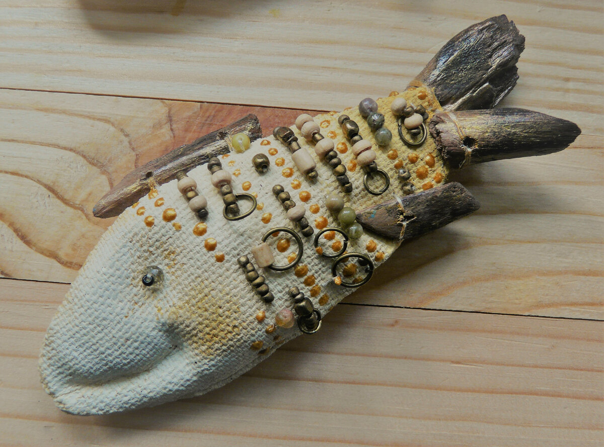И, наконец, самый чарующий этап творческого процесса: с помощью иголки и ниток пришиваем деревянные бусины, бисер, металлические детали по всему «телу» рыбы. При этом чередовать все элементы декора можно в любом порядке (за счёт однотипности деталей и их стилистического единства будет создаваться единый образ).