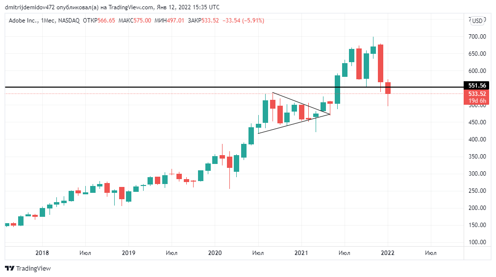Рекомендую обратить внимание на Adobe. Пока здесь нет никаких явных сигналов, но в ближайшее время по акциям компании на месячном графике вполне может сформироваться неплохой сигнал к росту. Правда срок удержания акции будет скорее всего от месяца до полугода, но это того стоит.