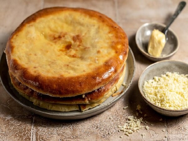 Осетинские пироги – рецепт из празднично-обрядовой кухни российского региона Северная Осетия – Алания, что находится на Северном Кавказе. Это круглые закрытые лепешки с разнообразными начинками. Внутри может быть мясо, овощи или сыр. Каждый пирог имеет свое название. Пирог с сыром и картошкой называется картофджин. Существует традиция подачи на праздничный стол трех лепешек, которые символизируют Бога, солнце (или небо) и землю. Но на похороны подают только два пирога. Чем тоньше пирог и больше начинки, тем он вкуснее. Поэтому лепешки делаются так, чтобы количество теста примерно равнялось количеству начинки. Традиционно при приготовлении осетинских пирогов используется плотный по консистенции и соленый на вкус осетинский сыр. Однако в России не всегда можно найти этот сыр в магазинах. Поэтому в качестве альтернативы рекомендуется смесь прессованной моцареллы и сыра фета или сулугуни. Главное, чтобы сыр был твердым (не водянистым) и соленым. Лепешка готовится из дрожжевого теста, выпек
