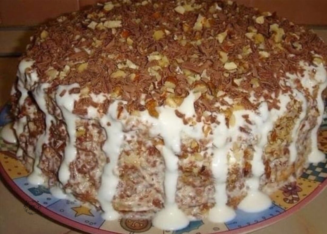 Второй слой: массу из сухофруктов, поливаем кремов и сверху орехи. Кладем корж.