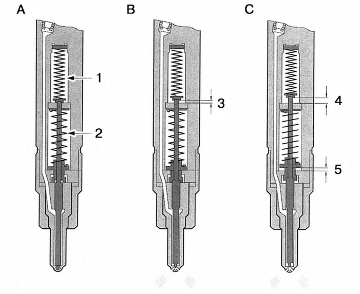 В их конструкции предусмотрено две пружины. Первая отвечает за давление начала предвпрыска, при достижении которого игла преодолевает давление более слабой пружины и приоткрывается на 0.01-0.03мм, осуществляя начальный впрыск небольшой порции топлива. При достижении номинального давления топлива, игла своим уступом, уперевшись в шайбу основной пружины и преодолевая суммарное сопротивление двух пружин открывается на полный впрыск. На картинке последовательно изображены эти этапы. И да, это совсем не коммон рейл и даже не его подобие) Данная схема позволяет значительно повысить плавность работы моторов с непосредственным впрыском, так как предвпрыск позволяет заранее плавно поднять давление в цилиндре, снизив ударное действие при впрыске основной порции топлива.