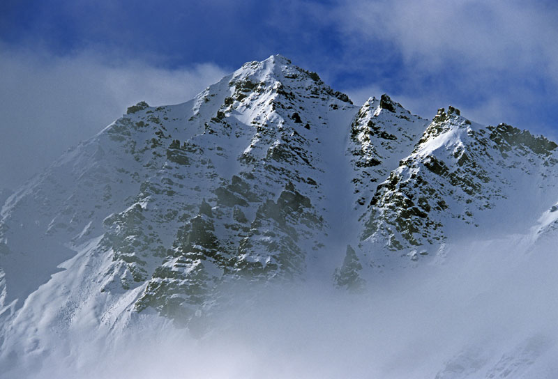 От места ночёвки в кустах, дальше нас ждало совершенно открытое пространство. И погода, кажется, испортилась навсегда. Идём сквозь дождь со снегом. К середине дня дошли до поворота реки, напротив перевала на Тыры. Следы двух поляков постоянно встречались до этого места. Здесь ещё удалось нащипать веточек с кустов полярной берёзки и карликовой ивы. Благодаря заготовленным заранее сухим щепкам, получилось сотворить костёр. Дальше придётся обходиться без живого огня. Впереди кажущееся безжизненным пространство в каменном коридоре неглубокого каньона Сунтара. Мокро и холодно. Низкая облачность, зависшая над головой, ограничивает мир нашего существования до размеров этого коридора. Дует холодный ветер со стороны перевала на Тыры, несёт мокрый снег. Идём с грузом вверх, снег лепит в спину. Возвращаемся за второй частью груза, снег лепит в лицо. И так до бесконечности, вперёд и назад, вперёд и назад. Река здесь уже совсем маленькая, переходим протоки свободно, практически в любом месте. Чуть выше на горах снег лежит уже сплошным покровом. Со стороны левого берега, во мраке угадываются очертания конусообразной горы, которую мы обозвали Фудзиямой. Над ней, иногда, сквозь пелену снега, тусклым пятнышком солнце напоминает о своём существовании. Наверное, в этом есть что-то от мазохизма. Когда очень тяжело и плохо, в определённое время наступает некий критический момент, стоит пройти через который, и ты вдруг начинаешь получать не то что удовольствие, но что-то сродни эйфории. Потом, через некоторое время осознаёшь, что это была новая ступень, поднявшись на которую, твои возможности возросли, а трудности остались чуть ниже по степени воздействия.
