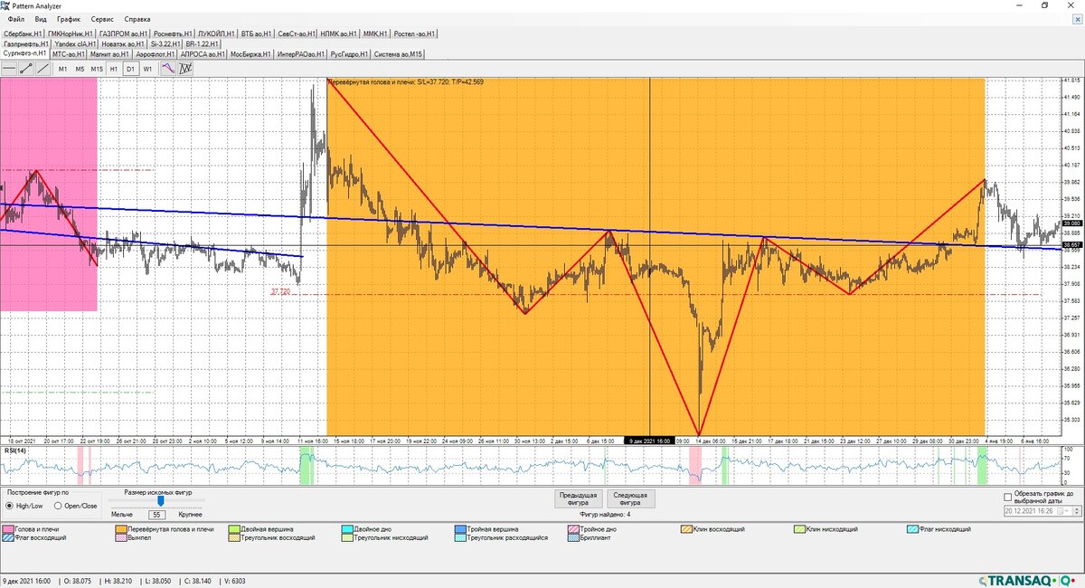 Анализ графика проведен с помощью аналитической программы по автоматическому анализу биржевых графиков PATTERN ANALYZER. Программа Pattern Analyzer обнаружила на графике Сургнфгз-п, H1 новый торговый сигнал (графический паттерн): Название фигуры: Перевернутая голова и плечи Тип сделки: Покупка Стоп-лосс ниже: 37,50 Тейк-профит: 42,50