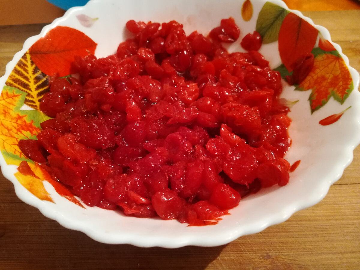 Сегодня думала чем бы порадовать свою дочурку. Вспомнила, что летом наморозили домашнюю войлочную вишню. Но перед заморозкой извлекли все косточки, перебирали долго, но это того стоит. Для пирога использовала самое простое тесто и ингредиенты. Тесто: 1шт яйцо категории СО 1 стакан сыворотки, можно использовать кефир Растительное масло – 3 ст.л. Мука в\с пшеничная – 400 грамм Вишня размороженная не отжатая – 300 грамм 1стакан сахара Сода 1ч.л. с горкой Уксус 9% - 1 ст.л. Соль щепотка Приготовление: Можно написать все смешать и готово можно печь. Но давайте по порядку. В миску разбиваю одно яйцо. Вливаю обычную сыворотку из холодильника. Добавляю растительное масло. Всыпаю сахарный песок. Вишню размораживаю в микроволновки и вместе с соком добавляю в тесто. Все хорошо перемешиваю. Тесто получается сладкое и такое вкусное, аромат вишни просто надо пробовать. По цвету становиться розовым. Добавляю одну чайную ложку соду, которую гашу одной столовой ложкой 9% уксуса. Перед тем как соду поло