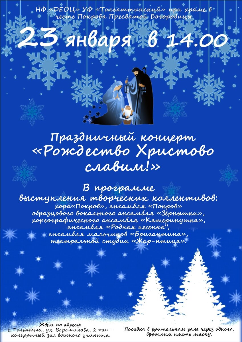 23 января в 14.00 воспитанники Детского епархиального образовательного центра при Покровском храме Тольятти приглашают всех желающих на благотворительный рождественский концерт. который состоится в концертном зале бывшего военного училища по адресу; ул. Ворошилова, 2а