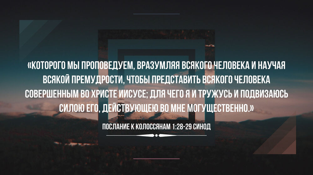 «Которого мы проповедуем, вразумляя всякого человека и научая всякой премудрости, чтобы представить всякого человека совершенным во Христе Иисусе; для чего я и тружусь и подвизаюсь силой Его, действующей во мне могущественно» (Кол. 1: 28, 29).