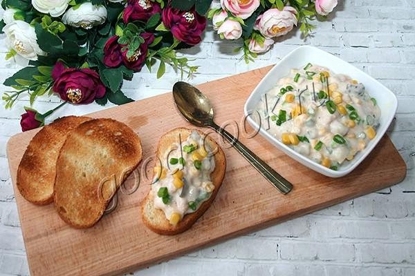 Часть консервированной фасоли перемалывается в пасту и становится похожей на соус майонез. И в этом нежном крахмалистом соусе находятся сладковатые зёрна кукурузы и хрустящие ядрёные кубики солёных огурцов. Чем ядрёнее огурцы, тем вкуснее получается салат. Дополнительную остроту добавляет зелёный лук. А чеснок, перемолотый вместе с фасолью, придаёт очень тонкий аппетитный аромат.