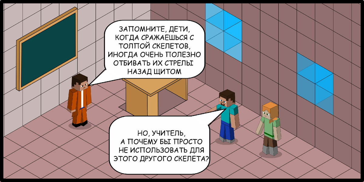 В этом выпуске вы узнаете, как эффектно и эффективно использовать выстрелы скелетов, увидите, как некоторые зачарования могут сыграть против вас, и вновь встретитесь с профессором Вредштейном и результатом его последних работ. Используй силу врага своего Зачаровала на свою беду Военизированная овца Тем временем ОВЦА (Оборонительная Военизированная Центральная Авиабаза). С этого выпуска фоны будут выглядеть немного по-другому. Я попытаюсь приблизить их к тому, что мы видим в Minecraft во время игры. В следующий раз будет еще больше изменений!