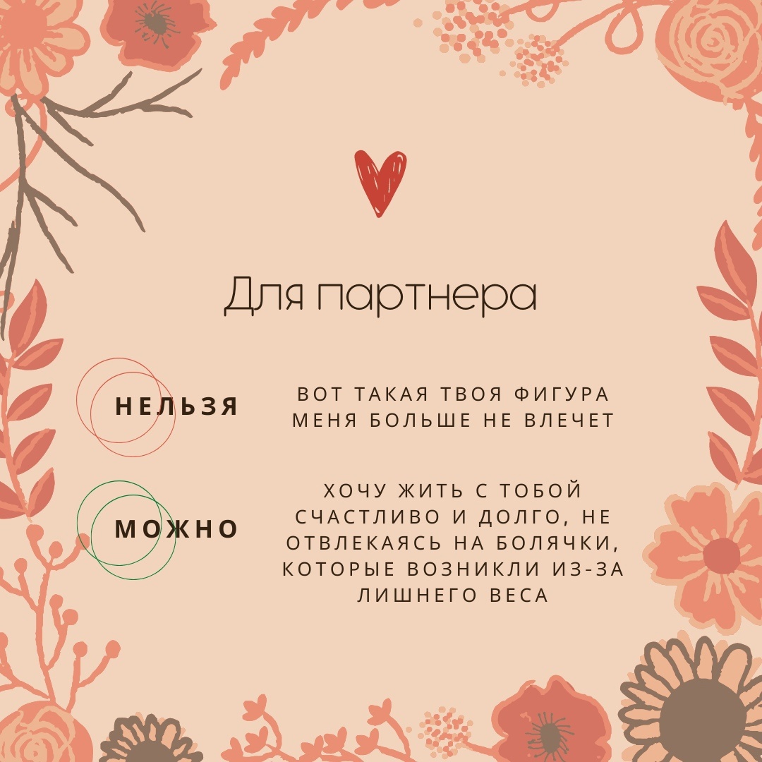 Порой мы даже не задумываемся, как неаккуратно разговариваем с близкими нам людьми. Особенно не замечаем, как случайно можем обидеть человека не подумав. А ведь худеющие люди находятся в зоне тех, кого надо поддерживать и оберегать, потому что одно неаккуратное слово или замечание может сбить весь настрой продолжать работу над собой. В этой статье мы разберем, какие фразы лучше не произносить в присутствии худеющего человека, а какие — наоборот, использовать в разговоре с ним, если вы обсуждаете такую щепетильную тему. Запрещенные и разрешенные фразы Как помочь сбросить вес? Было полезно? Подписывайся и делай репост!