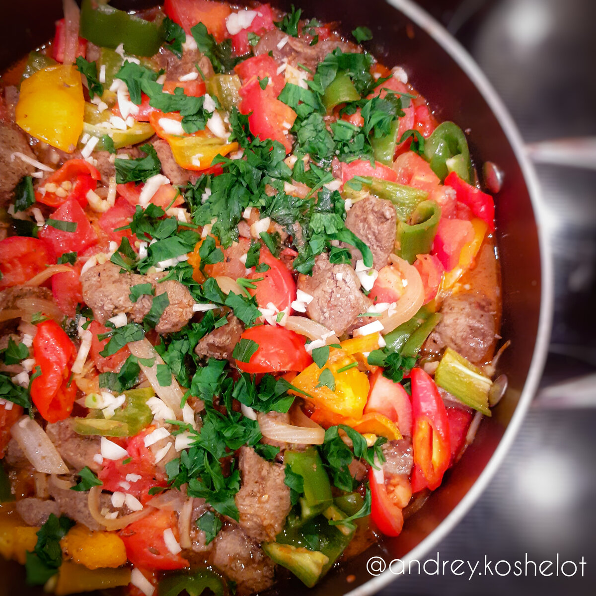 Овощи желательно взять разных цветов, так получится не просто очень вкусно, но и ярко и красиво! Для этого рецепта хорошо подойдет свиная или говяжья печень, но в этот раз я взял печень косули, получилось очень вкусно! 1. С печени около 1,5 кг снимаем пленку, если требуется, нарезаем на средине кубики. 2. Болгарский перец 2 шт - на кубики довольно крупного размера. Помидоры 2-3 шт так же на кубики. Лук 1-2 шт на полукольца. Острый перец - на крупные кольца, по остроте и количеству решайте сами. Чеснок 4-5 зубчика и петрушку мелко шинкуем. 3. Кладем на сковороду сливочное масло 50 гр и что бы оно не подгорело добавляем 50 мл растительного. 4. Масло растопилось и сразу отправляем жарить печень. Не долго, пару минут, пока печень не побелеет. Мешаем реже и аккуратно, что бы не развалилась. 5. Теперь добавляем лук, и еще жарим одну минуту. Не забываем аккуратно перемешивать. Посыпаем специями: зира, черный перец, паприка, соль - количество специй по вашему вкусу, зиру растираем. 6. Зак