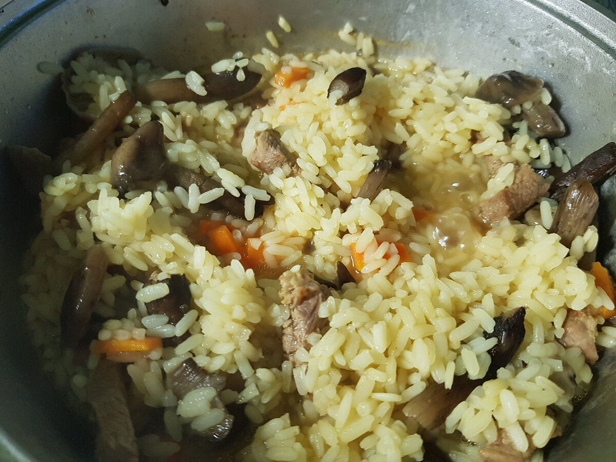 Рис с мясом и грибами ))) почти плов Нам понадобится: 1 - 1.5 стакана риса 300 гр свинины (или любого мяса , какое предпочитаете) 300 -400 гр грибов (у меня замороженные опята) 1 морковь маленькая По желанию лук репчатый (у меня его нет). Для начала порежем мясо кусочками и отправим в разогретый казан обжариваться до корочки. Помешивать не забываем ) Мясо обжарилось добавляем морковь и через 2-3 мин грибы. Все еще обжариваем минут 10 и добавляем рис. Я беру РИС ДЛИННОЗЕРНЫЙ ПРОПАРЕННЫЙ , он не разваривается , получается рпссыпчатым. Высыпаем рис , добавляем воду чтоб на 2 пальца покрывала сверху , добавляем соль, перец, специи по вкусу. Я добавила куркуму . Все тушим до готовности риса . Помешиваем периодически.. Вода должна испариться, но многие любят с бульончиком -это уже кто как предпочитает. Приятного аппетита. Мое затраченное время с подговкой примерно 45 мин- 1 час . плов #ужин #едаНаура #обед