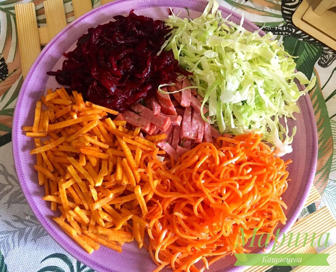 Ингредиенты: моркови по-корейски, варёной свеклы (или по-корейски), капусты или 1 средний огурец, копчёной колбасы, картофельных чипсов соломкой, Майонез , Укроп по желанию