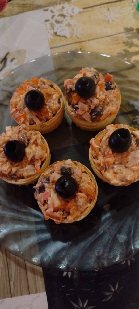 Ингредиенты: Тарталетки, Чернослив, Свинина, Икра красная белковая, Крабовые палочки, Майонез, Оливки, Сыр Способ приготовления: Свинину отварить до готовности мелко порезать добавить мелко порезанные чернослив и крабовые палочки сыр добавить икру перемешать заправить майонезом заполнить тарталетки и украсить оливками