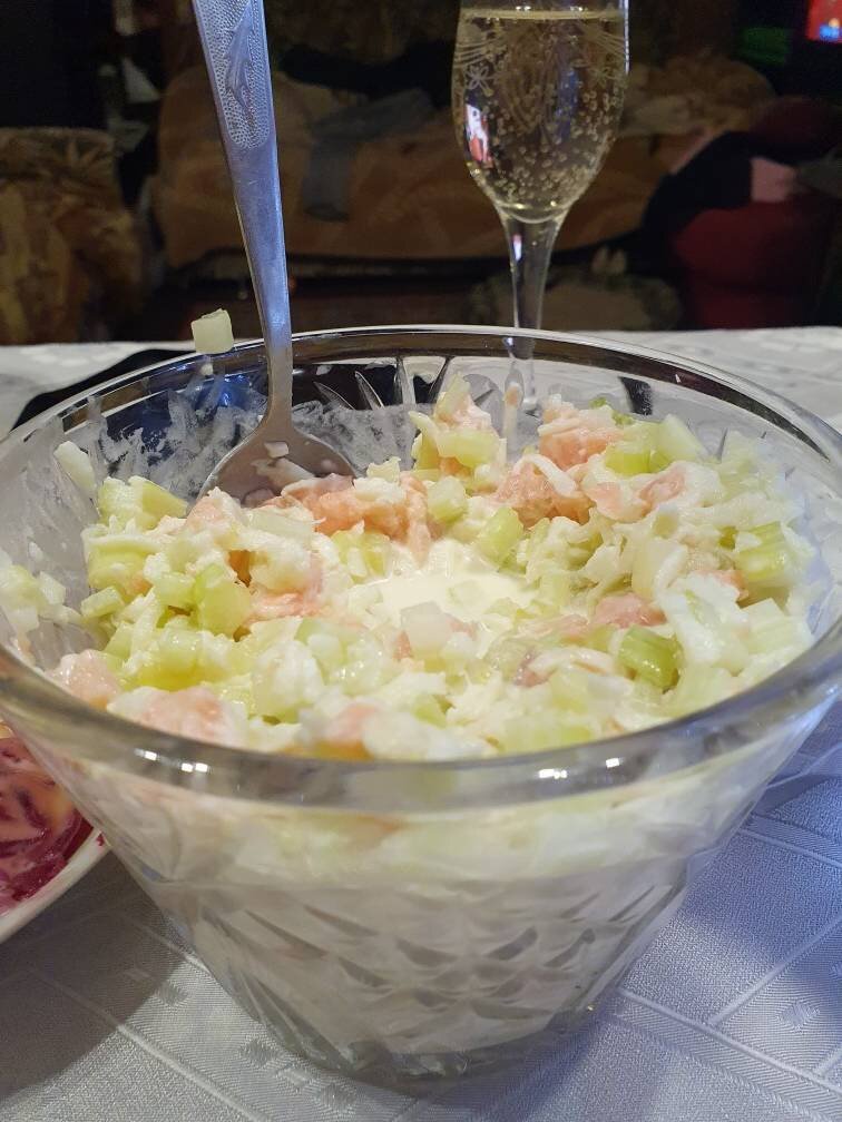 Вкусный, лёгкий, к новогоднему столу. Ингредиенты: сельдерея, малосоленой форели, зелёных крепких яблока, майонез + сметана Способ приготовления: Сельдерей режем очень мелкими кубиками. Яблоки чистим от кожуры и трем на крупной терке. Форель режем мелкими кубиками. Все смешиваем, добавляем 3 ст.л майонеза пополам с греческим йогуртом. Приятного аппетита.