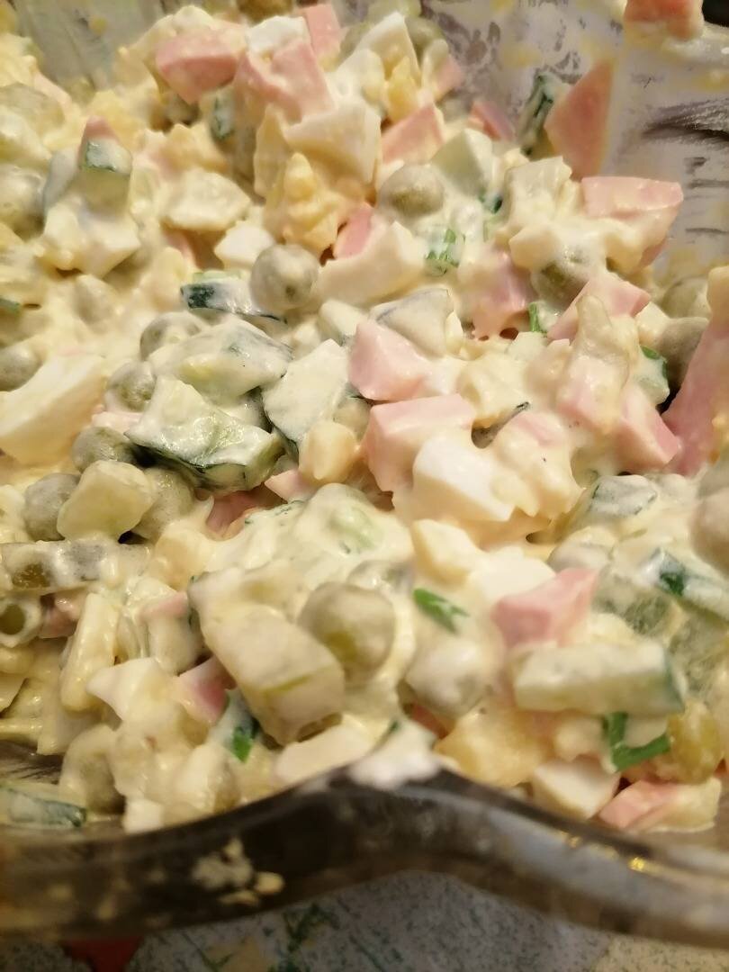 Ингредиенты: колбасы варёная, отварной в мундире картофель, маринованных огурца, свежий огурец, яиц варёных, горошек, зелёный лук, майонез Способ приготовления: Колбасу, картошку, яйцо, огурец кубиками порезать. Добавить горошек, лук. Заправить майонезом. Приятного аппетита!