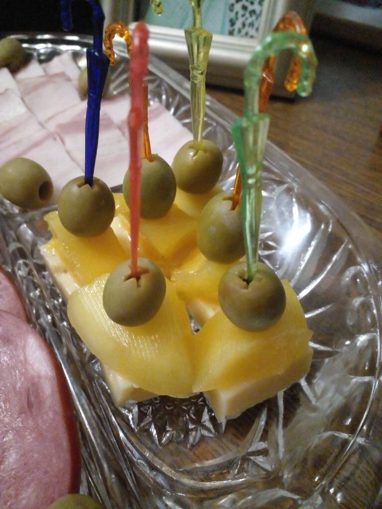 Сыр и манго режем кубиками, насаживаем на шпажку: Сыр Манго Оливки