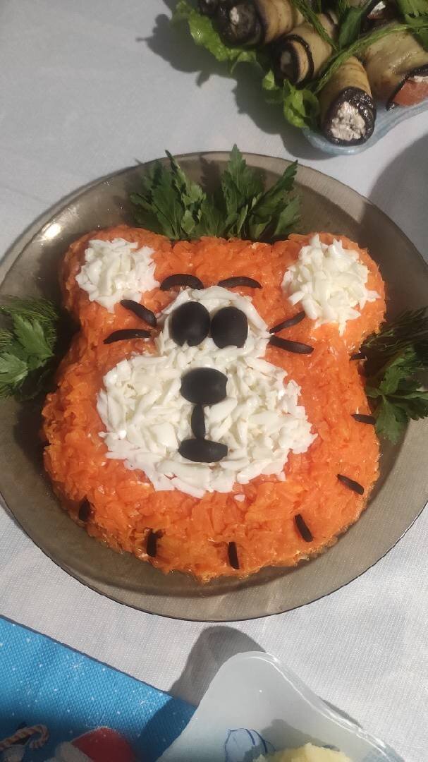 #новыйгод Очень нежный, сочный салатик! Семья заценила, всем понравился😋 Заменил нам оливье. Ингредиенты: целая куриная грудка, свежих шампиньонов, отварная морковь, отварные картофелины, отварных яйца, красного лука, Твёрдый сыр , Майонез, Соль, чёрный молотый перец Способ приготовления: Заранее обжариваем или отвариваем куриную грудку. Отвариваем овощи, яйца. Грибы моем, нарезаем мелким кубиком и обжариваем с луком (мелко нарезанным кубиком), я к ним добавила чёрный молотый перец. Послойно выкладываем салат, смазывая каждый слой небольшой сеточкой из майонеза. 1. Тёртый отварной картофель, майонез. 2. Куриное филе, нарезанное мелким кубиком, майонез. 3. Обжаренные с луком шампиньоны, майонез. 4. Натертые отварные желтки, майонез. 5. Тёртый сыр, майонез. 6. Последний слой - тертая морковь в виде мордочки тигра и тертые белки яиц. Украсить чёрными маслинами (можно заменить на чернослив). Приятного аппетита! 🧡 С НОВЫМ ГОДОМ ТИГРА🐯