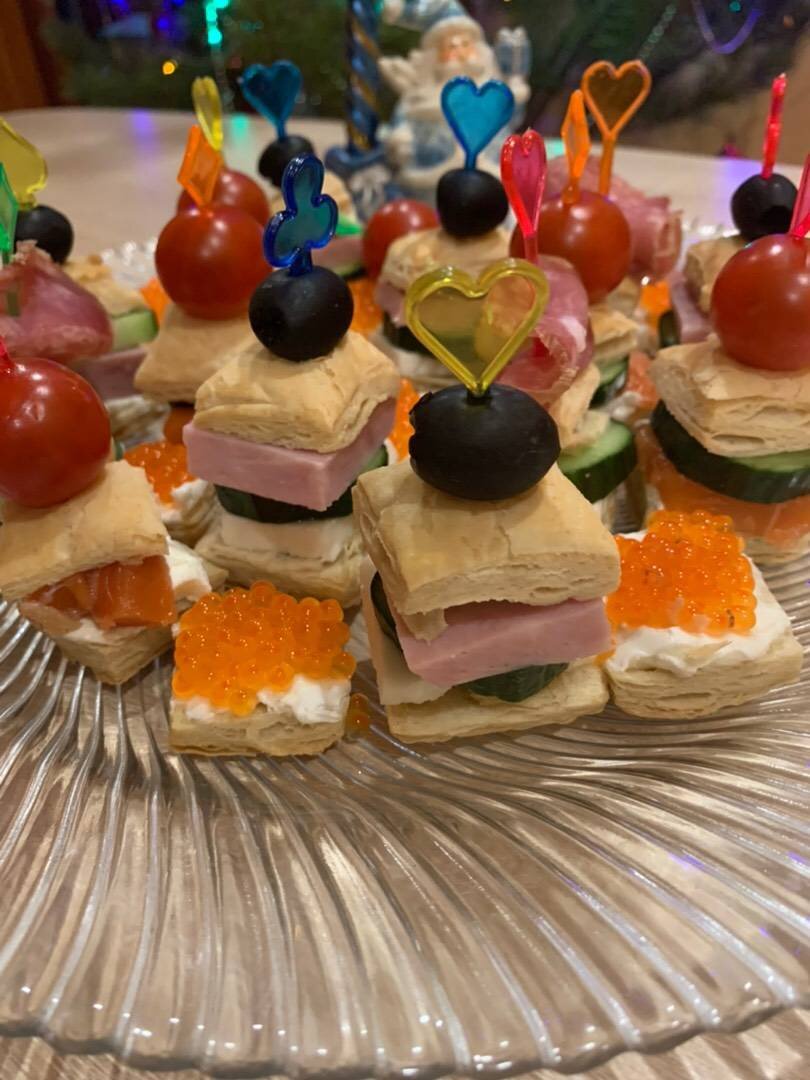 Варианты начинок можете составлять по своему вкусу. Ингредиенты: Слоёное бездрожжевое тесто, Помидоры черри, Оливки, Ветчина, Творожный сыр, Малосольная красная рыба Способ приготовления: Слоеное тесто разрезать на маленькие квадратики, уложить на противень и испечь заготовки. Разломить квадратики пополам и составлять канапе по вашему вкусу. На нижнюю часть - Сыр, огурец, ветчина. Накрыть второй половинкой, сверху оливку и проткнуть шпажкой. Второй вариант. Сыр, рыбка, огурчик, помидорка. Можно вверху сделать бантиком колбаску. И также очень удобный вариант бутербродиков с икрой.