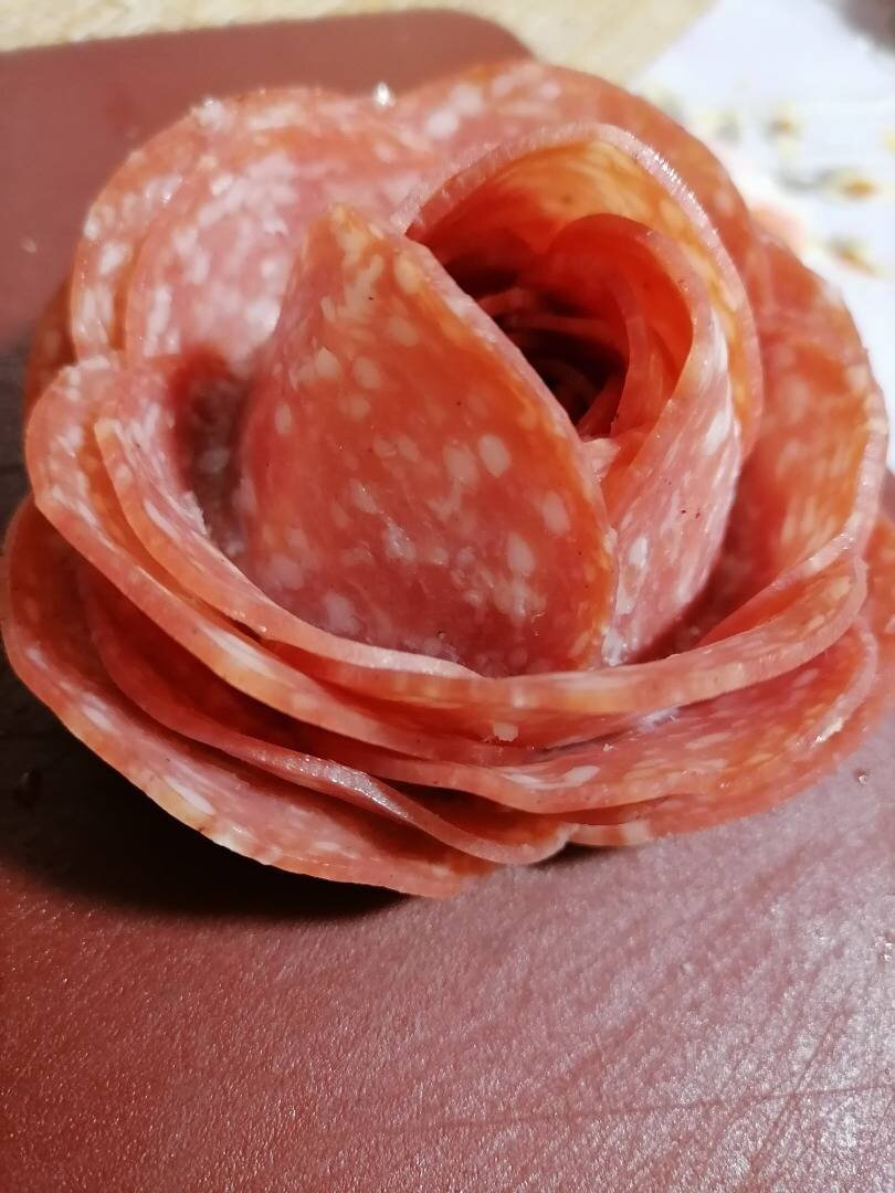 Быстро, просто и очень красиво! Ингредиенты: нарезка салями Способ приготовления: Взять стопку. Открыть нарезку. По очереди колбасу втыкаем в стопку. Таким образом, чтобы половина была в стопке, а другая половина выглядывала из стопки. Продолжаем так крутить внахлёст. Затем переворачиваем стопку и получаем розочку. Наслаждайтесь!