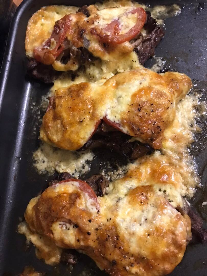 Знаменитый шеф К. Ивлев поделился этим рецептом в соцсети. Прекрасное блюдо без заморочек стало главным на новогоднем столе. Ингредиенты: говядина, сыр гауда, майонез, помидора, грибы (у меня вёшенки), соль, перец, оливковое масло, сливочного Способ приготовления: Кусок говядины порезать на медальоны примерно по 200 гр на порцию. Медальоны покрыть пленкой и отбить с обеих сторон до толщины 1 см. Обжарить медальоны на небольшом количестве оливкового масла с обеих сторон примерно по 3 минуты. Выложить на противень, слегка посолить и поперчить. Далее на сливочном масле обжарить порезанные грибы (шампиньоны или вешенки). Выложить грибы на мясо. Далее шеф резал лук на кольца и выкладывал их на грибы вместе с кольцами из помидоры. Но домашние попросили обжарить лук, т к его не все любят. Обжаренный лук выложила поверх грибов. А потом положила помидоры. Сыр натираем на терке, я брала гауда, добавляем такое же количество майонеза. Перемешиваем и распределяем поверх помидоры. Не забываем солить