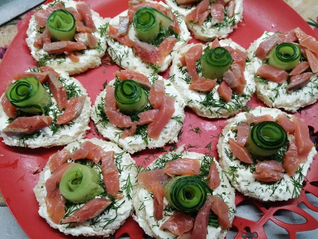 Ингредиенты: Огурец, Сливочный сыр, Укроп, Красная рыбка, Батон Способ приготовления: Сделать кружки из батона, смазать сливочным сыром. Укроп мелко нарезать, покрошить на батон. Огурец нарезать на слайдеры, свернуть, разрезать пополам, получился розочка. Положить в центр батона. Рыбку у меня форель, нарезать мелко, разложить вокруг розочки. Приятного аппетита.