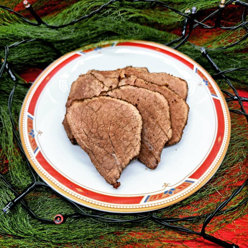 Традиционное английское запечённое мясо, можно использовать в салатах. Ингредиенты: толстого края говядины, оливкового масла, соль и перец Способ приготовления: Смазываем мясо смесью молотых перцев с солью и оливковым маслом, маринуем в холодильнике 3 часа. Быстро обжариваем со всех сторон на большом огне, чтобы "запечатать". Важно: не переворачивайте протыкающими предметами, только двумя лопатками, ложками или щипцами! Заворачиваем в фольгу и запекаем 15 минут при 250°С. Далее запекаем при 160°С примерно 1 час — 1 час 15 минут. Достаём из выключенной духовки через полчаса, даём полностью остыть, разворачиваем и тонко нарезаем.