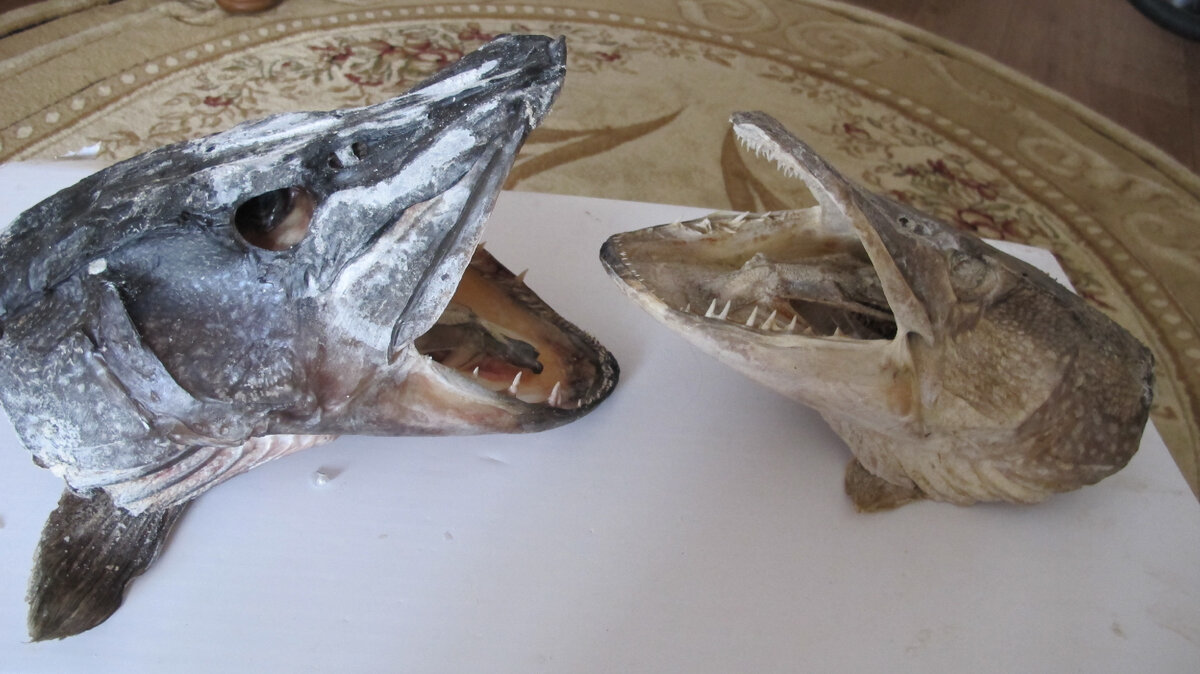 Сегодня наткнулся на старую фотографию и решил развлечь Вас в праздничный дни. На фото 2 щучьи головы. Та, которая слева меньшего размера – это голова щуки, которую я поймал на джиг осенью. Щука была длиной 90 см и весила 7 500. А рядом голова щуки, которую я поймал на жерлицу зимой. Длина 106 см. Попробуйте угадать вес.