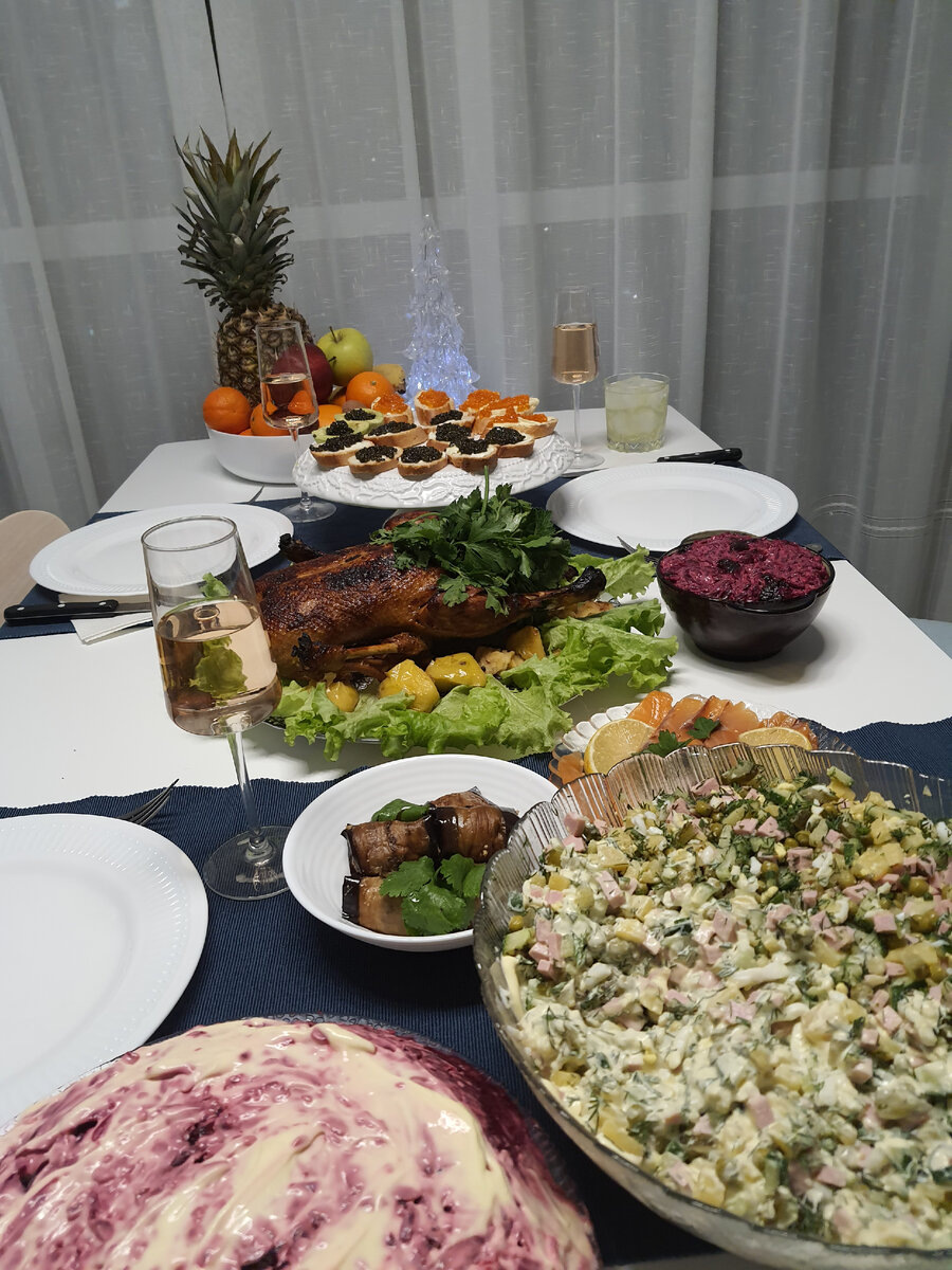 Накануне вечером запекла овощи для салатов: картофель для оливье и селёдки под шубой,морковь для селёдки под шубой,свёклу для "Королевского" салата и селёдки под шубой,сварила яйца для оливье и селёдки под шубой. Муж замариновал утку в нашем любимом апельсиново-медовом маринаде.