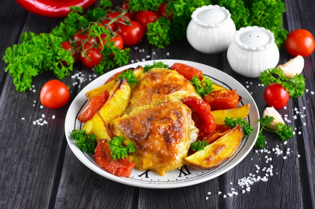 Сочная, аппетитная, вкусная - праздник каждый день! Картошка с курицей и помидорами в духовке - бюджетный и быстрый способ приготовить сытное блюдо, которое включает в себя и гарнир. Подходит на каждый день и на праздничный стол! ИНГРЕДИЕНТЫ: Как сделать аппетитную картошку с курицей и помидорами в духовке? Очень просто! Для начала подготовьте необходимые ингредиенты по списку. По желанию можете взять целую курицу весом около 1,5 кг и разделать ее на порционные куски. Или взять определенные части курицы, например, голени, бедра или грудку. Сметана подойдет любой жирности. Курицу вымойте, обсушите, разрежьте на порционные части. Зубчики чеснока очистите и натрите на мелкой терке или пропустите через пресс. Выложите курицу в миску, добавьте сметану, тертый свежий чеснок, соль и перец. Сметану можете заменить на натуральный йогурт без добавок или майонез. Хорошо перемешайте. Курица должна быть полностью покрыта сметанно-чесночной смесью. Оставьте мариноваться 30 минут или дольше, как позв