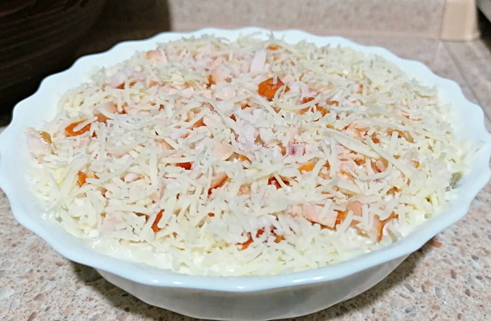 Ингредиенты: Копчёная куриная грудка, Репчатый лук🧅, Твёрдый сыр🧀, Соленый огурец🥒, Яйцо 🥚, Заправка:, Сметана, Горчица