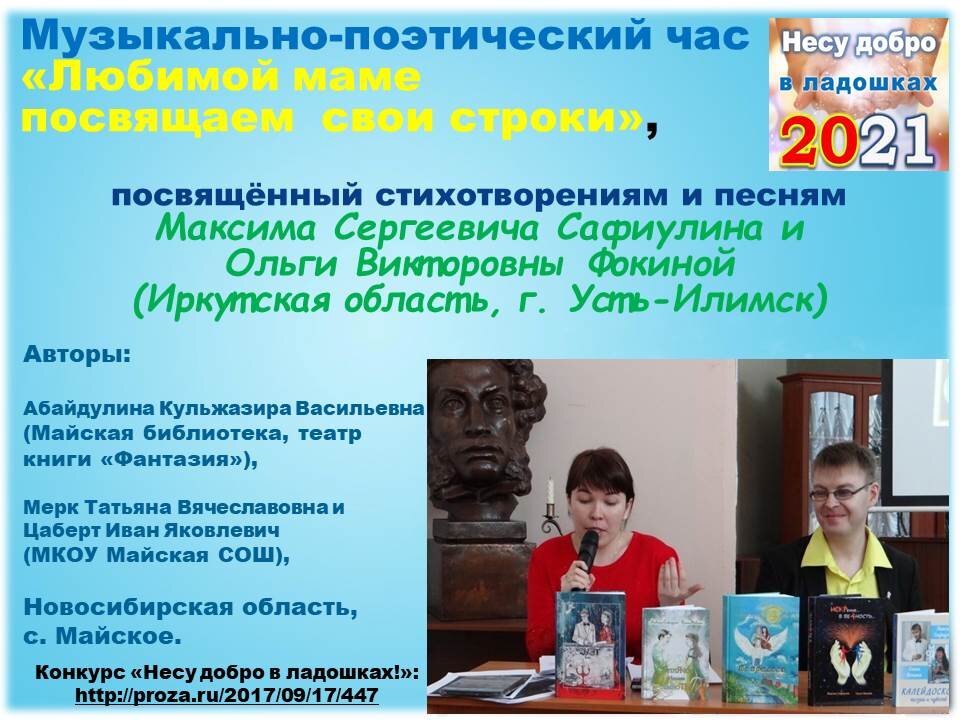 Ведущий 2. Поэзия Ольги Фокиной и Максима Сафиулина несёт свет, доброту и любовь. Их стихи для детей о мамах пронизаны любовью к ним и переживаниями за подрастающее поколение.