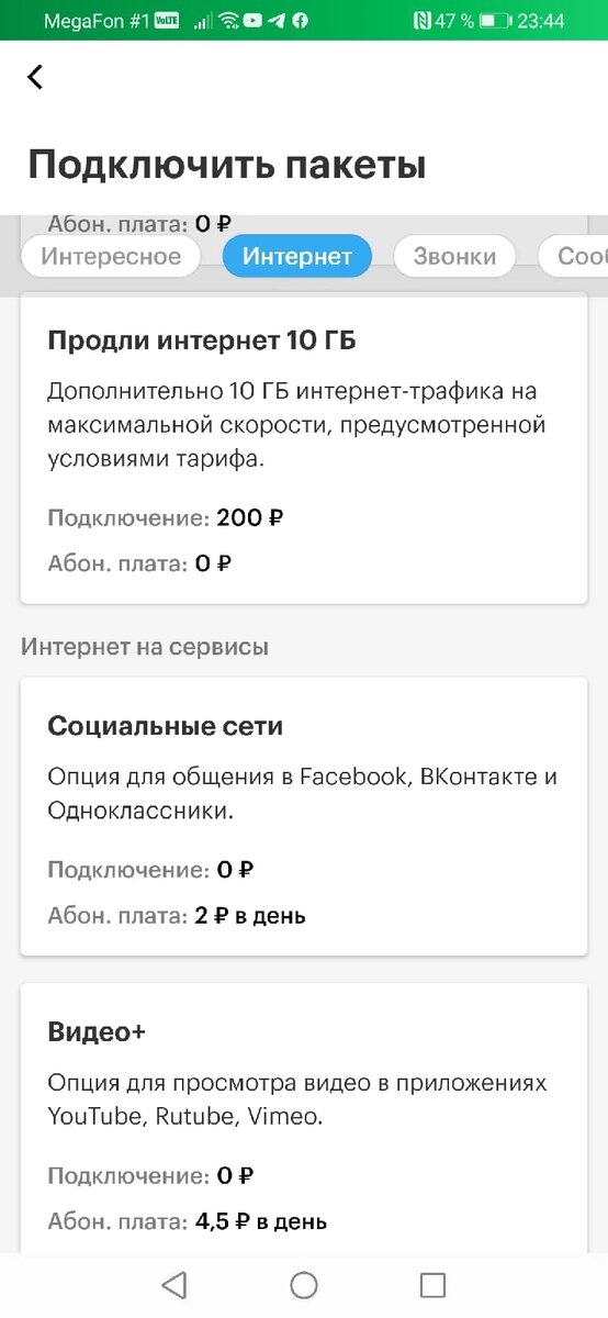 Не так давно писал про безлимитный интернет от компании Мегафон. Типа 400 ₽ в месяц и полная свобода. А если, предположим, такая свобода не нужна? А надо всего гигов 10-20 и дёшево. Посмотрел у себя по тарифу. Плачу я 310 ₽ в месяц. Там подключена опция безлимитный интернет. Если его не подключать то там за эти денежки два пакета интернета-30 и 15 гигабайт. Станет мало, можно докупить гигабайты. Вот скрины из личного кабинета с предложениями от оператора. Типа 4 пакета 1, 3, 5 и 10 гигабайт. Но ценники на мой взгляд крайне завышенные. Но каждый сам определится, насколько ему такое предложение актуально. И потом, это смартфонный тариф и в модеме или роутере корректно работать не будет. Кому нужен лимитированный интернет для работы в любых устройствах нам есть что предложить. Итак, приступим. 10 гигабайт самый маленький пакет интернета. Стоимость 100 рублей в месяц. 30 гигабайт за 150 рублей в месяц. 40 гигабайт за 200 рублей в месяц. За те же 200 рублей, мне оператор предлагает всего 1