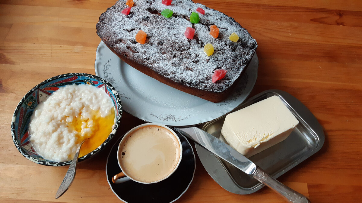 #завтрак - рисовая каша на топленом молоке, кофе, рождественский кекс с цукатами и сухофруктами. Пеку его уже, кажется, лет 9 подряд, на каждые новогодне-рождественские праздники. Очень вкусно его есть с маскарпоне, но в этом году у меня не осталось. Со сливочным маслом - тоже вкусно. Кекс после выпечки должен вызреть, вылежаться. У меня всего 2 недели он дозревал. Обычно около месяца.