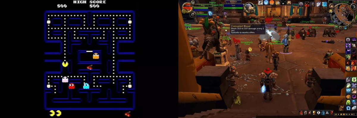 Почти все ранние видеоигры начинались с одной и той же модели дохода. Пользователи платили деньги, чтобы играть в игру. Первые игры, такие как Pac-Man (слева), позволяли геймерам сыграть один или два раунда, прежде чем требовать дополнительной оплаты. Более поздние игры, в которые можно играть на персональных компьютерах, такие как Call of Duty или World of Warcraft (справа), продавались по бессрочным лицензиям или по подпискам. Хотя транзакции были простыми, пользователи не имели большого влияния. Самым заметным улучшением стало просто больше игрового времени в виде пакетов расширения контента.