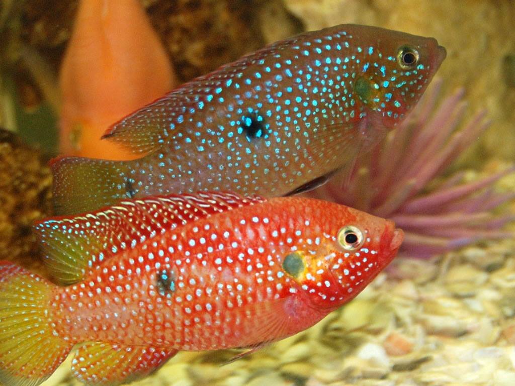 Этих рыбок порой называют жемчужными из-за яркой, переливчатой окраски. Небольшие, от 7,5 до 10 сантиметров в длину, они популярны у тех, кто разводит рыбок в аквариуме. Очень оригинальным образом охраняют хромисы - красавцы свое потомство. Рыбка - мать держит рот открытым, и ее мальки заплывают туда, когда им требуется безопасное убежище. Подобным приемом пользуется не только изображенная здесь рыбка. Несколько других видов того же семейства поступают точно так же. Хромисы мечут икру на каменистом или песчаном дне среди камней, и оба родителя охраняют это гнездо. Когда мальки выходят из икринок - их бывает несколько десятков, - они начинают охотиться на мелких насекомых или искать кусочки пищи вблизи гнезда. Если на мальков падает тень или появляется какой-нибудь другой признак грозящей опасности, они устремляются к ближайшему ярко окрашенному предмету - как правило, это оказывается их мать. Где же ей спрятать их? Ведь поблизости нет ни водорослей, ни пещеры. Поэтому она открывает ро