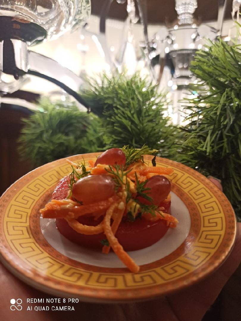 #канапе #новогоднийстол #пп Ингредиенты: Помидоры, Морковь чеснок, Майонез, Виноград, Сыр Способ приготовления: На помидор выложить морковь с сыром и майонезом. Украсить виноградом и зеленью.