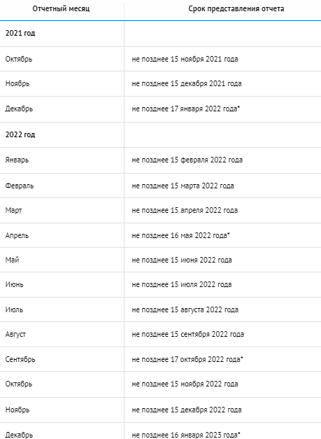 * Если срок сдачи отчетности выпадает на нерабочий день, то этот срок переносится на ближайший рабочий день.