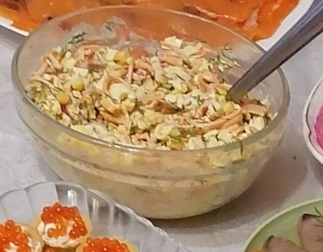 #новыйгод #новогоднееменю Ингредиенты: крабовых палочек, вареных яйца, моркови по-корейски, кукурузы, майонез , укроп Способ приготовления: Крабовые палочки, яйца и укроп нарезать. Добавить к ним кукурузу и корейскую морковь, заправить майонезом. Если нужно, посолить по вкусу. Приятного аппетита!