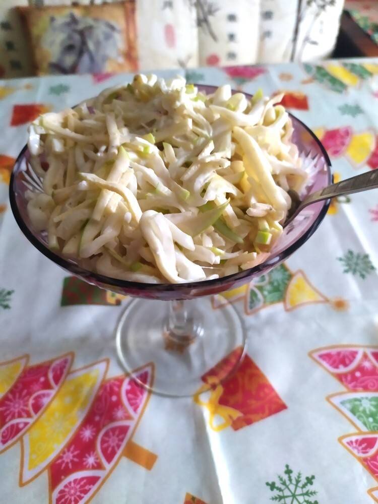 Ингредиенты: тушки кальмара, большое зелёное кислое яблоко, репчатый лук, Соль, молотый черный перец, сахара, Кипяток, уксус, Майонез Способ приготовления: Кальмары,чистим отвариваем 1,5 мин в кипящей воде. Остудить и нарезать тонкой соломкой. Яблоко нарезать тонкой соломкой. Лук режем полукольцами. В миску залить кипятком + сахар + уксус на 5 мин. Слить воду, обсушить. Смешать все составляющие салата, добавить соль и молотый перец и заправить майонезом. Приятного аппетита 😊.
