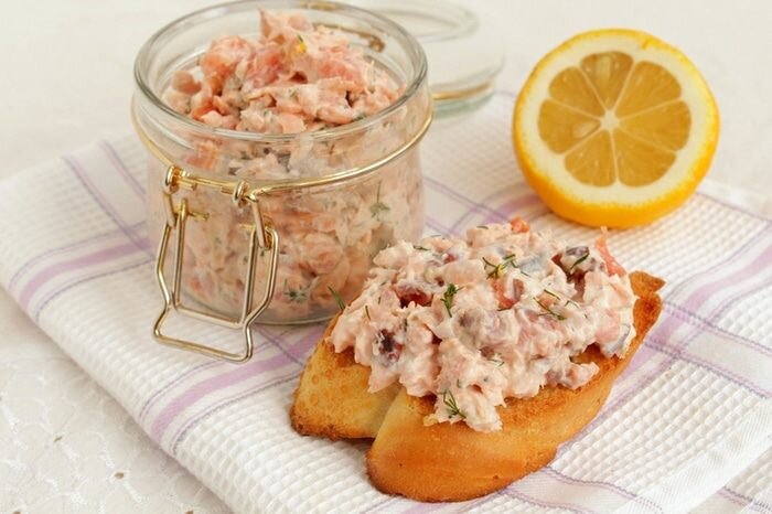 Рийет из лосося очень универсальное блюдо, закуска просто идеальна для праздничного стола и в будние дни она прекрасно впишется в ваш завтрак. Масло виноградной косточки хорошо подчеркнет рыбный вкус рийета. Для рийета вам понадобится - лосось свежий филе : 300 г, лосось копченый : 100 г, масло виноградных косточек : 1 ст. л., творожный сыр : 2 ст. л., горчица дижонская : 1 ч. л., вино белое полусухое : 1 ст. л., укроп : по вкусу, соль : по вкусу, перец черный молотый : по вкусу, лимонный сок : по вкусу, лимонная цедра : по вкусу, миндаль : 1 горсть. Лосося отварите в чуть подсоленной воде с лавровым листом 10 минут, затем остудите и разомните вилкой. Мелко нарежьте копченого лосося, порежьте укроп, натрите цедру, добавьте лимонный сок. Добавьте творожный сыр, перемешайте, посолите, поперчите по вкусу. Добавьте рубленый миндаль. Перемешайте и уберите в холодильник минимум на 3 часа.