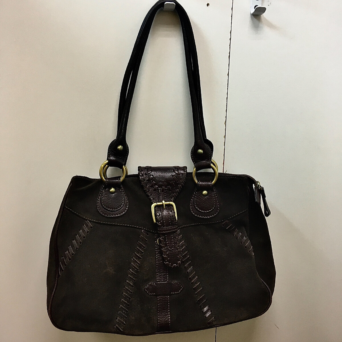 Коричневая из замши за 1500р, вернее за 1350р в 10% скидку. Сумка в отличном состоянии, можно носить на плече, ручки позволяют.