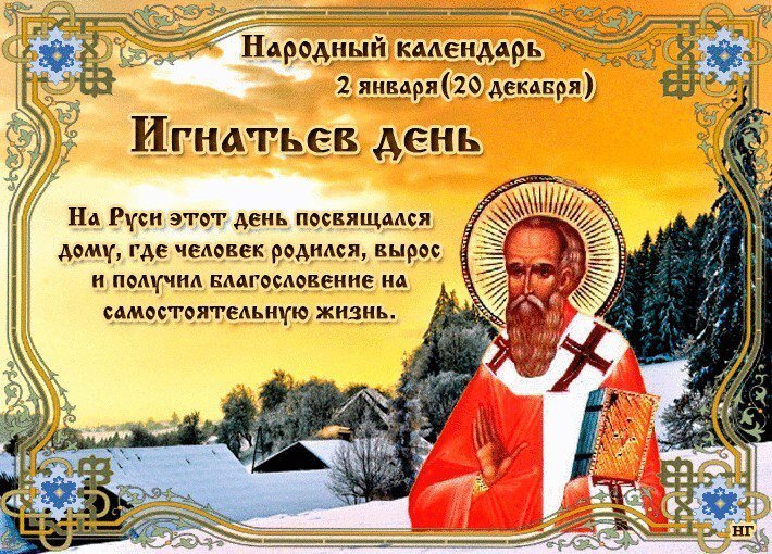 2 января в России по народному календарю праздник - Игнатьев день. Священномученик Игнатий Богоносец учился у Иоанна Богослова в первом и втором столетиях. В то время правил император Траян. Игнатий получил прозвище Богоносец, так как в детстве мальчик побывал на руках у самого Иисуса Христа. К святому за исцелением приходили больные люди. В период Траянских гонений на христиан Игнатий был арестован. В Риме Богоносца растерзали голодные львы.