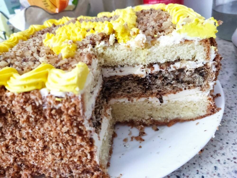 Ингредиенты: муки, яиц + 5 отдельно белка, сахара, орехов, крахмала, масла + 1 ст л для смазки формы, сгущенного молока, сахара + 80 мл воды для пропитки (сироп) Способ приготовления: Для бисквита взбить яйца с сахаром не менее 5 минут. Добавить муку и тщательно перемешать венчиком, взбивать нельзя. Смазать форму маслом и поставить в духовку на 40 минут при температуре 180 * Для белкового бисквита: В отдельной посуде смешать 1 ст ложку муки, 1 ст ложку крахмала и молотые орехи. В сухой посуде взбить белки до полного загустения. Ложкой смешать белки и сухие ингредиенты. Смазать форму и отправить в духовку на сушку на 2 часа 30 минут при температуре 150* Когда бисквит готов разрезать его на две части. Верхушку аккуратно срезать, ровно, перемолоть верхушку в блендере. Пропитать бисквитные коржи сиропом. Оставить подсыхать. Когда белковый корж готов, то достать с духовки и оставить подсыхать. Приготовить крем. Масло комнатной температуры взбить миксером вместе со сгущенкой. Когда белковый