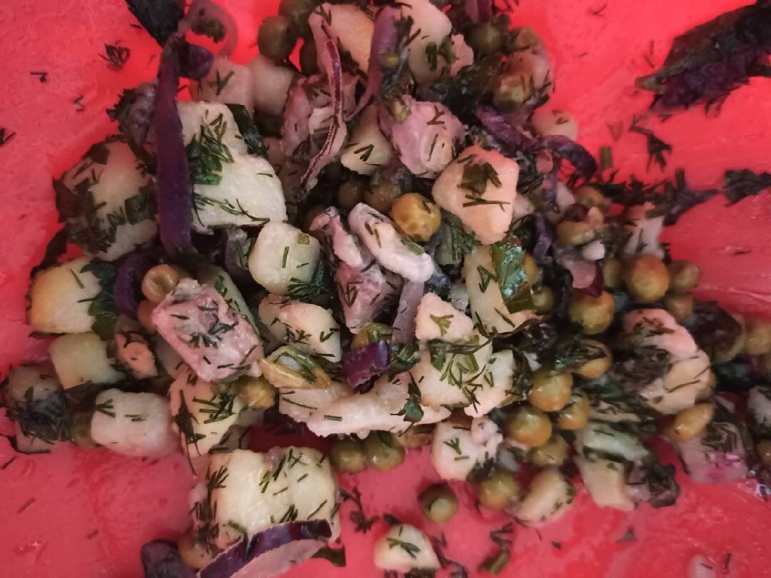 Если надоел салат под шубой отличный вариант. Легко готовится, а на вкус божественно. #салат #наскоруюруку #ужиндлямужа #новыйгод Ингредиенты: картошки, красного лука, укропа и петрушки, пресервы селёдки, зелёного горошка Способ приготовления: Картошку поставить вариться в мундире. Лук порезать тонко полукольцами и залить кипятком. Селёдку можно взять в пресерве либо целиком, как вам удобно. Я брала в пресерве, убрала перец, лаврушку. Порезала мелко. Картошку остудить мелко порезать, зелень тоже мелко порезать, с горошка слить сок. Соединить все ингредиенты, добавить растительное масло. Хорошо перемешать. Приятного аппетита.