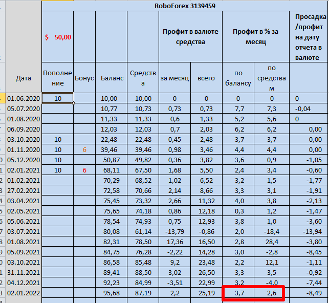 Здравствуйте, Друзья! Поздравляю всех с наступившим 2022 годом. Здоровья, счастья, любви и профитов! Отчет за 19 месяц работы портфеля советников. Каждый месяц, публично я вкладываю 10$ в рынок Форекс. Торгую с помощью торговых роботов и показываю как развиваются события. eG_BD_Day на RoboForex За декабрь 2021 eG_BD_Day на RoboForex принес +3,7% по балансу и +2,6% по средствам. eG_Spring на Forex Chief За декабрь 2021 принес +6,3% по балансу и +11,1% по средствам. eG_BD_Day на GrandCapital За декабрь 2021 принес -0,8% по балансу и +27,0% по средствам. Gobsek’s_Grid на FIBO Group За декабрь 2021 принес +4,8,0% по балансу и -15,4% по средствам. Общий итог Итог по портфелю: по балансу +3,9%, по средствам +3,5% относительно прошлого месяца. Очередные 10$ на FIBO Group.