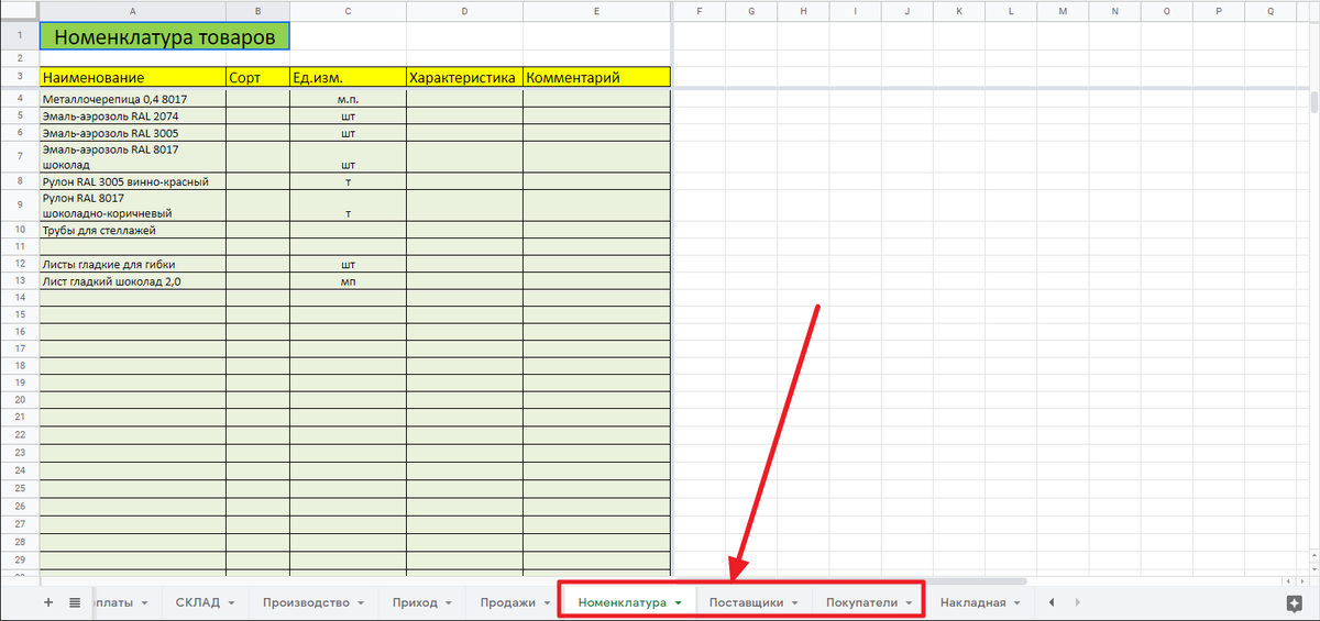 Я считаю, что малый и микро бизнес, на этапе развития может обойтись бесплатными, самодельными инструментами, для закрытия простых бизнес процессов. Так например, для одного клиента я разработал таблицу для складского учёта, которая объединила в себя и функции бухгалтерского учёта. Более подробно смотрите в видео ниже: Схема работы таблицы следующая: Основная вкладка - "СКЛАД". Здесь будут все товары которые есть на складе (в штуках и деньгах). Они будут попадать сюда из "Прихода" и "Производство", а всё что будет занесено в "Продажи", будет минусовать остатки на складе. Для начала работы заполняем информацию на отдельных вкладках номенклатура товаров, поставщиков и покупателей. Здесь мы заполняем в первую очередь наименование всех товаров которые покупаем и изготовляем, которые есть и будут. Далее всех поставщиков и клиентов. Эти данные будут нужны во всех остальных вкладках, где будем выбирать наименования из выпадающего списка. Теперь на вкладке "ПРИХОД" мы вносим товары кот
